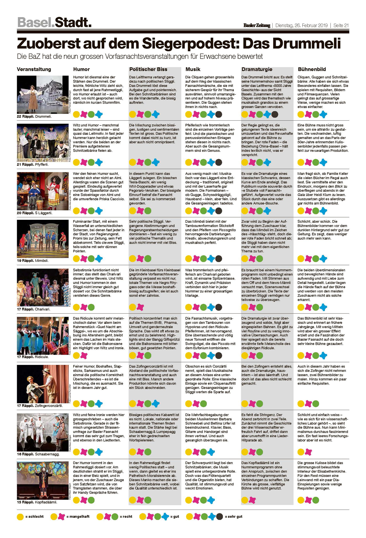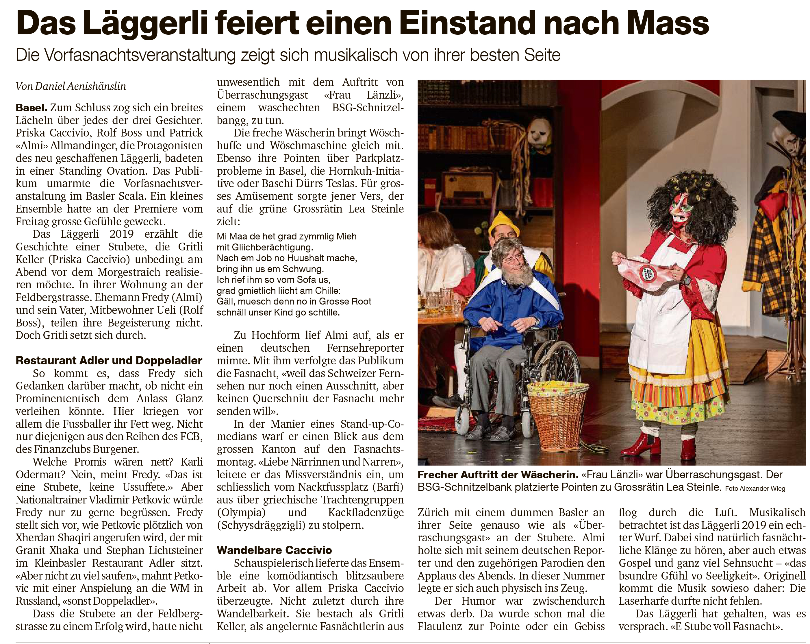 BAZ: Die Vorfasnachtsveranstaltung Läggerli zeigt sich musikalisch von seiner besten Seite. Das neu erschaffene Läggerli badete am Schluss in Standingovationen